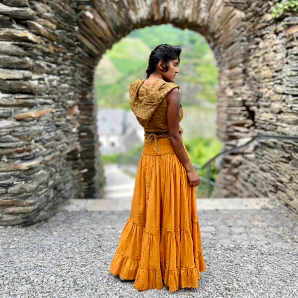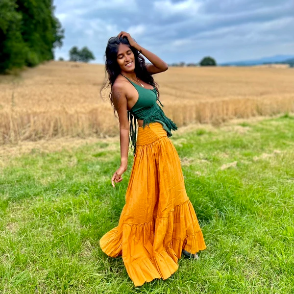 Wat deze rok zo bijzonder maakt, is dat je zelf kunt bepalen hoe je hem draagt. Draag hem bijvoorbeeld op de heupen in combinatie met onze Aphrodite Boho top of juist in de taille met onze Devi off shoulder. Wat je ook kiest, deze creatieve rok blijft je verrassen en is altijd een eyecatcher.