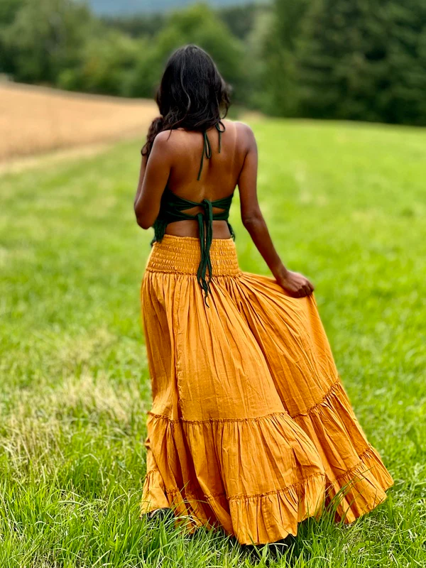 Deze prachtige rok is gemaakt van heerlijk zachte katoen en heeft een elegante, wijd uitlopende vorm. Perfect voor zowel zomerse als winterse dagen. De speelse lagen geven de rok een feestelijke Ibiza-look, waarmee je moeiteloos elke outfit een bohemian touch geeft!
