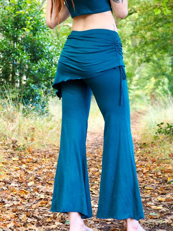 Deze prachtige yoga broek met flaired pijpen is gemaakt van een zachte, rekbare stof die met je meebeweegt. Over de broek valt een asymmetrisch rokje dat je aan beide zijden kunt aansnoeren voor een speels en flatterend effect – een echte Two Sisters touch. Het rokje zit overigens vast aan de pant:-)
