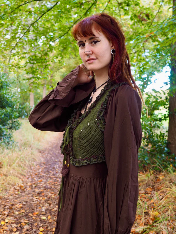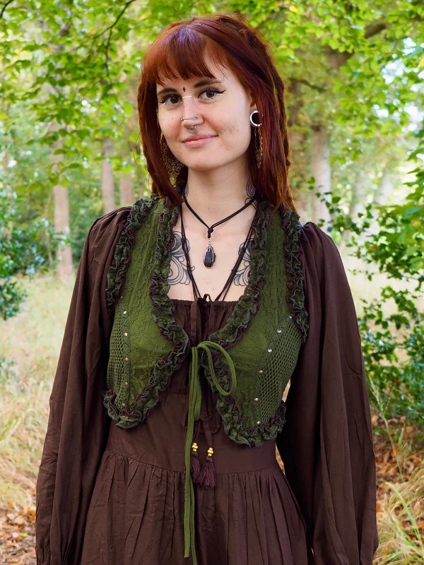 Het Aradia Vest is een echte statement piece — mystiek, vrouwelijk en krachtig tegelijk. Dit prachtige boho festival vestje is gemaakt van diverse materialen zoals zacht kant, stevige stof en fijne mesh details, en is volledig gevoerd met katoen voor extra draagcomfort.