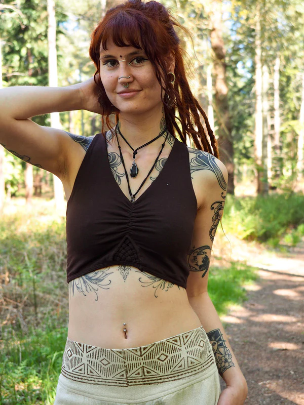 De achterkant van de Freya Bra Top is een ware blikvanger met zijn prachtig gevlochten band en messing ‘Flower of life’ detail. Dit detail bevindt zich op het bandje, dus het raakt je huid niet en voegt een vleugje elegantie toe aan deze top.