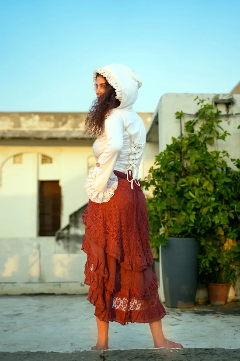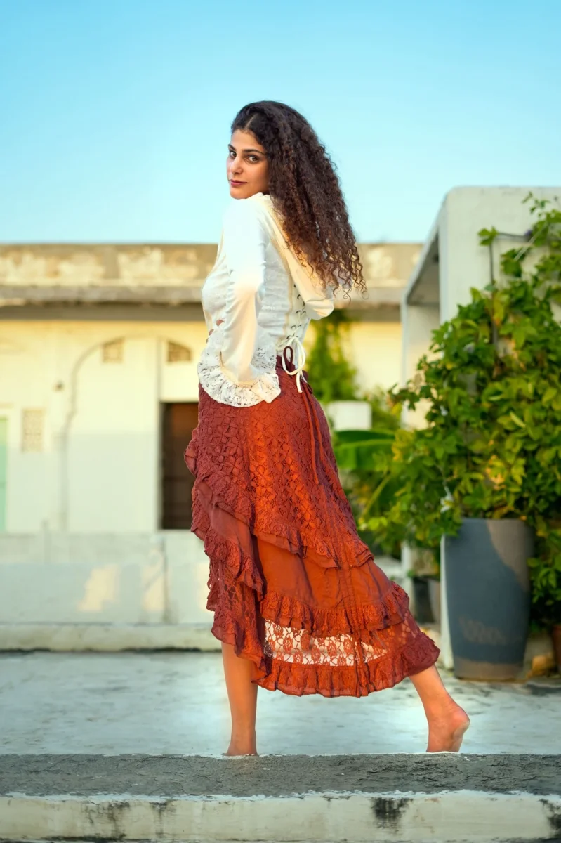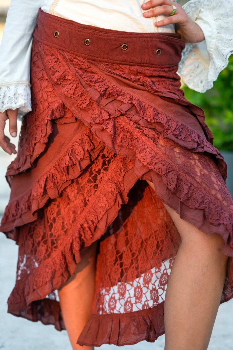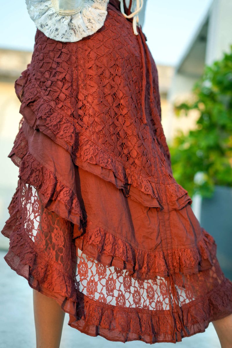 Onze Florence Rok is terug! We hebben zoveel vraag naar deze rok dat we die natuurlijk opnieuw voor jou laten maken! Deze rok is een echte bohemian droom: speels, vrouwelijk en met een vleugje mystiek. De rok heeft prachtige lagen van kant en ruches die sierlijk meebewegen bij elke stap die je zet. Het asymmetrische model geeft een zwierige look en laat net genoeg zien voor een speelse, vrouwelijke uitstraling.
