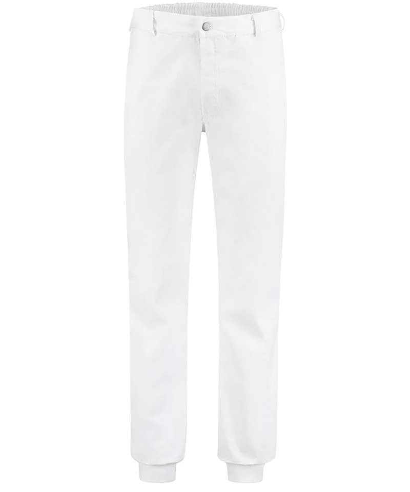 De broek is voorzien van een gulpsluiting met drukknopen, wat zorgt voor een veilige en praktische sluiting. De vaste elastiek in de tailleband en de riemlussen geven een comfortabele pasvorm die goed blijft zitten tijdens het werken. De tricot manchetten aan de onderzijde sluiten netjes om de enkels aan, waardoor stof, vuil en andere verontreinigingen minder kans krijgen. Ideaal voor gebruik in productieomgevingen of voedingsverwerking.