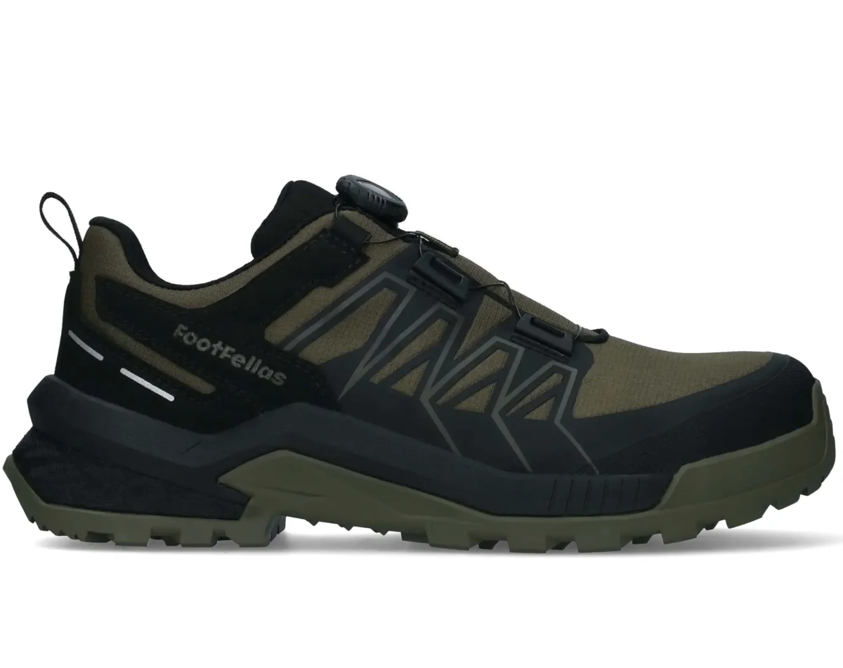 Footfellas S7S Max werkschoenen zijn gemaakt van waterdicht en ademend materiaal met een geïntegreerde sokconstructie die ervoor zorgt dat je voeten droog blijven onder alle weersomstandigheden. Deze sportieve lage veiligheidsschoenen zijn volledig metaalvrij en hebben een lichte NANO veiligheidsneus en een flexibele antiperforatiezool, zodat je beschermd blijft zonder extra gewicht. Met de praktische BOA-snelsluiting trek je de schoenen razendsnel aan en uit. Geen gedoe met veters die losraken: één draai aan het DISC-systeem en de schoen zit perfect vast. In de hak zorgt de E-TPU Powerheel voor demping en energieteruggave bij elke stap, wat merkbaar scheelt in vermoeidheid tijdens lange dagen. De anatomisch gevormde inlegzool biedt ondersteuning bij de voetboog en zorgt samen met de antibacteriële, ademende voering voor fris en comfortabel draagcomfort. De robuuste rubberen SR-loopzool met grove structuur geeft betrouwbare grip op natte, vettige of ongelijke ondergronden. De zool is hittebestendig tot 300°C (HRO) en de CI-isolatie zorgt dat de warmte van je voeten behouden blijft, ook op koude ondergronden. De zolen zijn bestand tegen olie en brandstof en hebben een FO normering. En dan heeft de Footfellas S7S ook nog eens een ESD certificering die ervoor zorgt dat statische elektriciteit wordt afgevoerd.