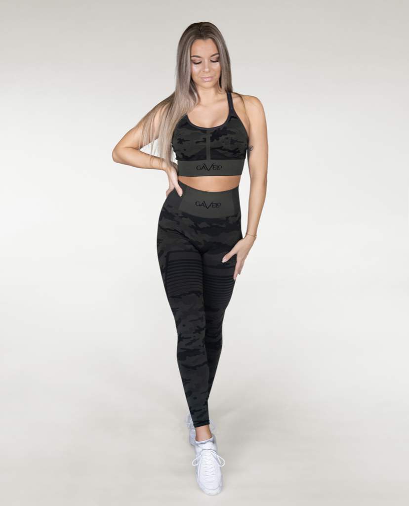 Mooie zwarte naadloze sportbeha in camouflagepatroon. Gemiddelde ondersteuning. Met uitneembare inzetstukken. Schouderbandjes in een mooi patroon op de rug. Brede, geribbelde zoom onderaan voor maximaal comfort! Stijlvolle en ongelooflijk comfortabele sportbeha in een stof die ademt en zacht aanvoelt op de huid. Past perfect bij Seamless Camo legging of als casual bh.