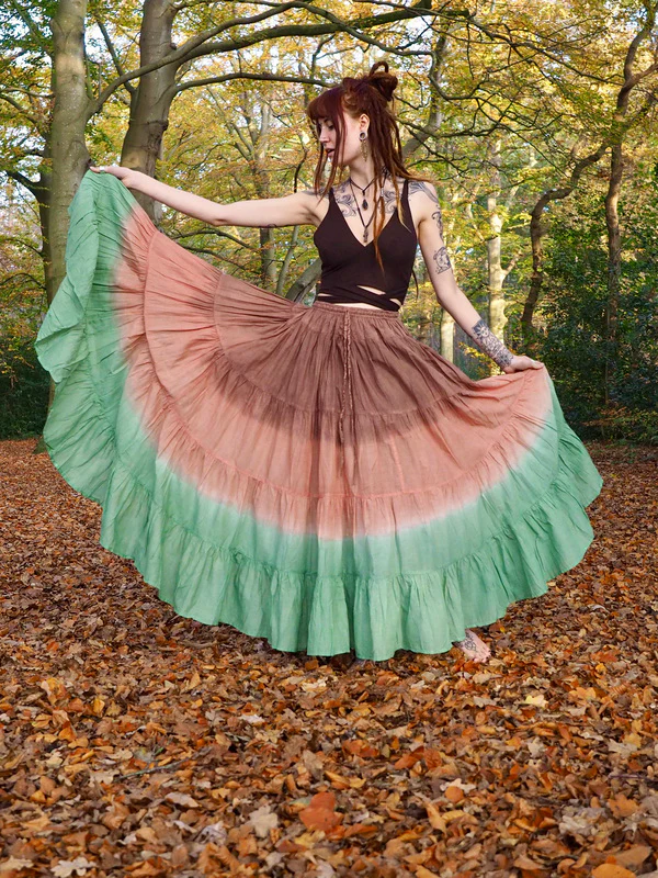 Elke rok is met de hand getie-dyed in India, waardoor geen twee exemplaren hetzelfde zijn — elk stuk is een klein kunstwerk vol karakter en liefde.