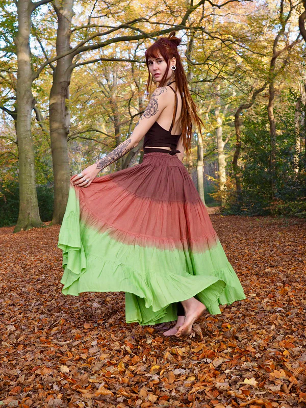 Elke rok is met de hand getie-dyed in India, waardoor geen twee exemplaren hetzelfde zijn — elk stuk is een klein kunstwerk vol karakter en liefde.