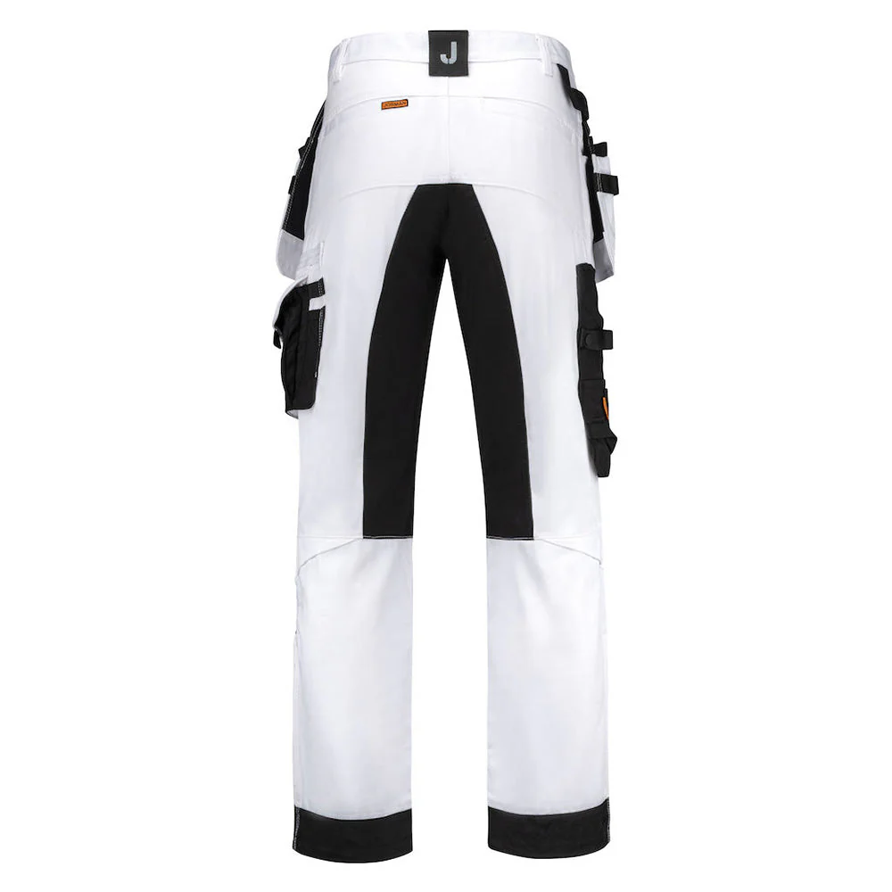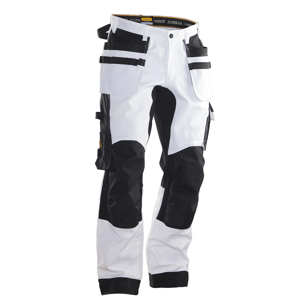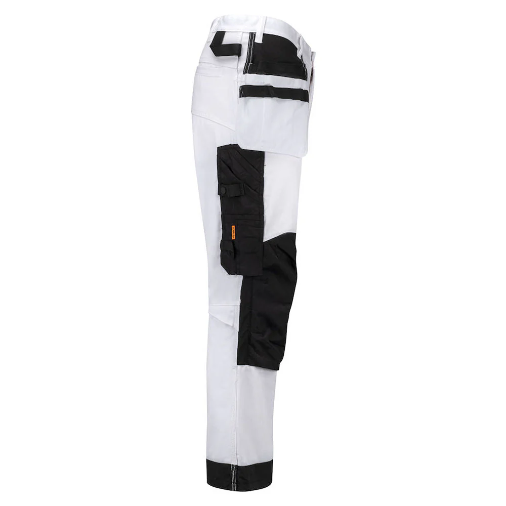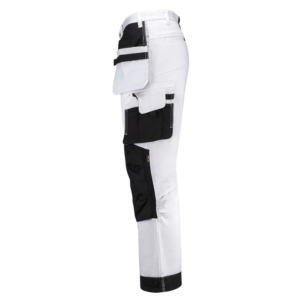 Schildersbroek met verstevigde stukken in het kruis van stretch Cordura® voor extra flexibiliteit. Gemaakt van ringgesponnen katoen/polyester Core, een stof met de sterkte van polyester en de zachtheid van katoen, wat zorgt voor uitstekende duurzaamheid en comfort. De schildersbroek heeft ruime holsterzakken en de binnenzak is gevoerd met waterafstotend FA™ polyamide. De broeken in de grotere maten hebben extra riemlussen. Verder heeft de schildersbroek een hamerlus, een zak voor een mes en duimstok en handige compartimenten voor schildergereedschap. De schuine zak op het been heeft een ritssluiting, een telefoonzak, een ID-kaartzakje en extra vak. Aan de onderzijde van de pijp zit een trekkoord.