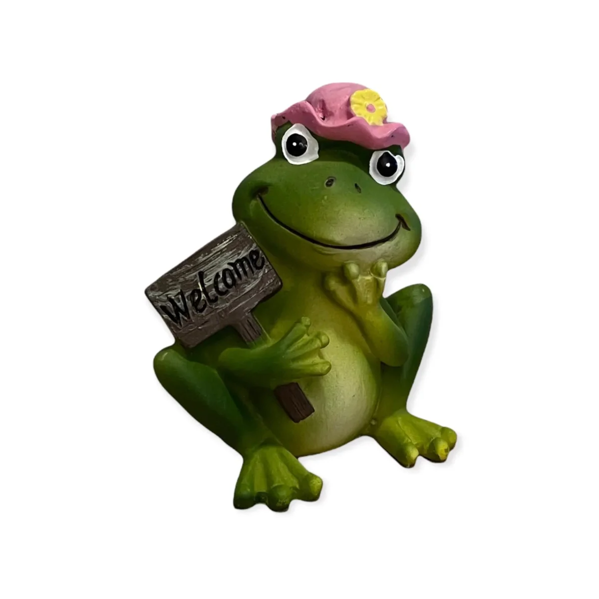 Geef je interieur een vrolijke twist met dit grappige kikkerbeeldje van H&H Collections! Deze guitige kikker draagt een roze hoedje en houdt een bordje vast met de tekst “Welcome” – perfect om gasten met een glimlach te begroeten.