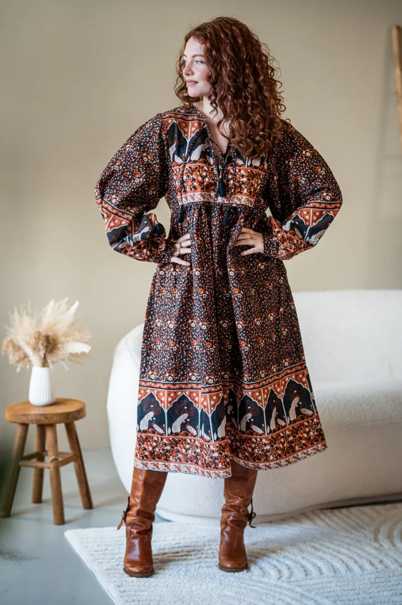 De Maeve is een elegante bohemian midi jurk die vrijheid en comfort moeiteloos combineert. Deze handgemaakte katoenen jurk heeft lange mouwen met een wijde inzet en een flatterende one-size pasvorm. Perfect voor elke dag, fotoshoots en zwangerschap.