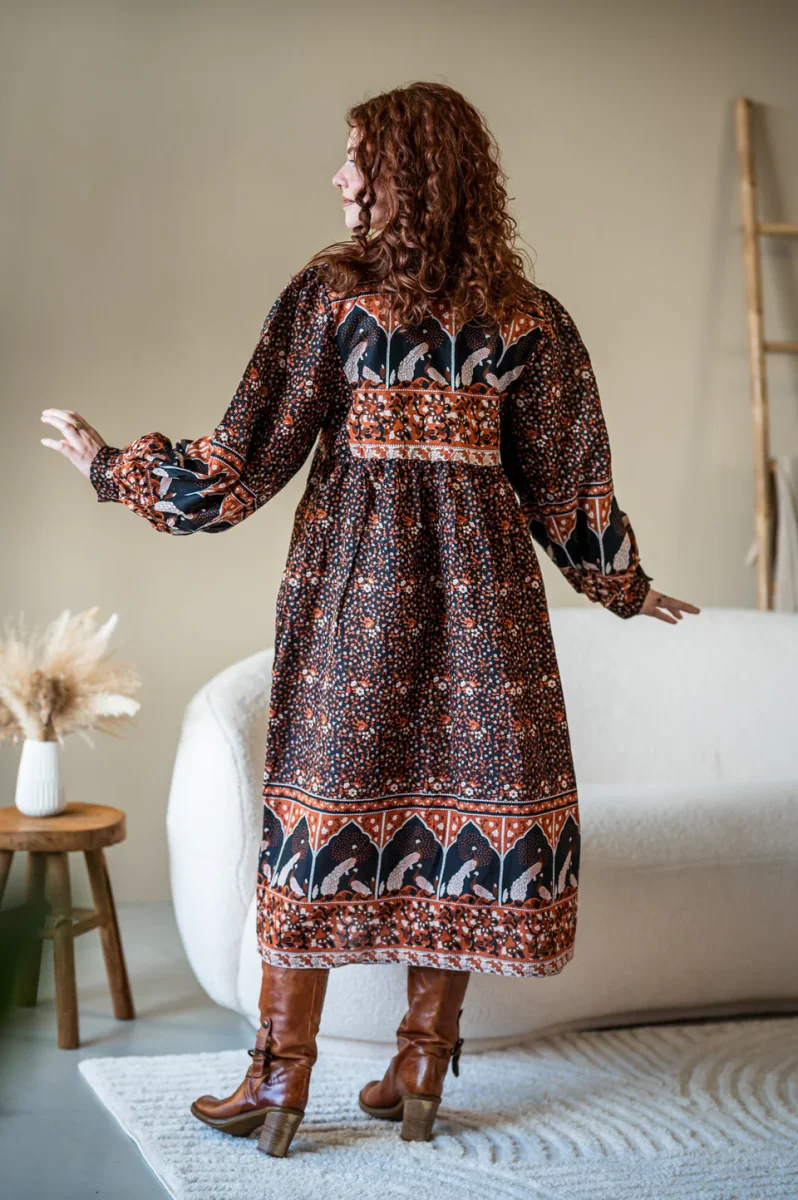 De jurk heeft lange mouwen met een zeer ruime mouwinzet, wat zorgt voor dat typische boho (Twosisters) gevoel: luchtig, zacht en vol beweging. Het pasje aan de voor- en achterkant geeft Maeve een mooie vorm zonder strak te zijn – flatterend, comfortabel en vrouwelijk.