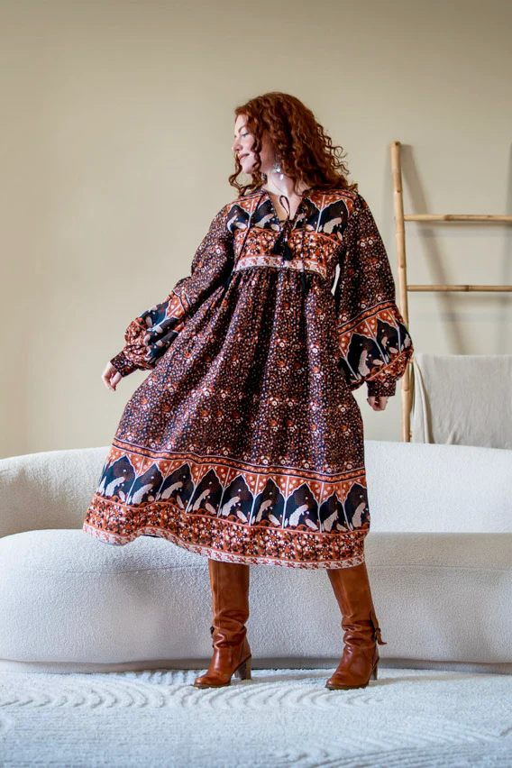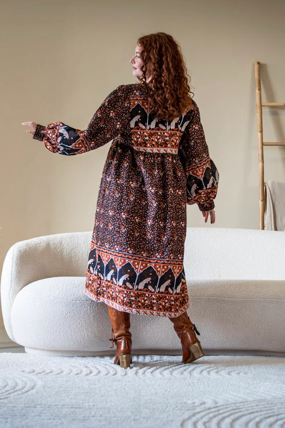 De rijke bohemian print en de speelse belijning maken deze jurk perfect voor elke dag waarop je jezelf wilt zijn. Draag haar met laarzen voor een krachtige, aardse look of met sandalen voor een meer zachte, zomerse vibe.