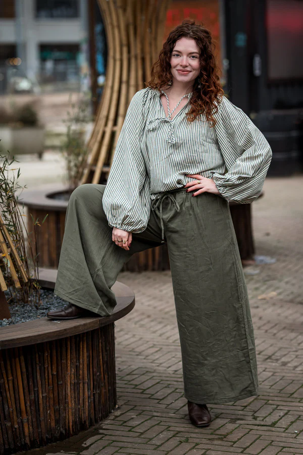 De heerlijke wijde en zwierige pijpen geven een speelse, elegante uitstraling die perfect met je meebeweegt. Het materiaal doet denken aan Poplin katoen: niet te dun, niet te dik – precies goed! Deze veelzijdige stof maakt de broek ideaal voor alle seizoenen. Of het nu zomer, winter of iets ertussenin is, deze broek zal je keer op keer omarmen.