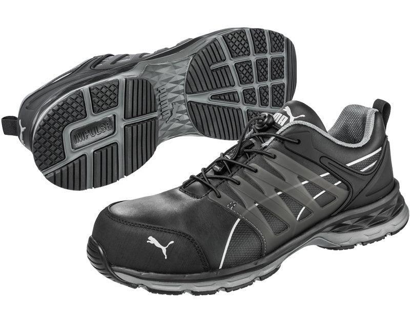 Puma S3 Velocity werkschoenen zijn gemaakt van soepel leer wat je gemakkelijk schoon kan maken. Deze lichtgewicht veiligheidsschoenen hebben een sterke glasvezel veiligheidsneus met voldoende ruimte voor je tenen, en een flexibele FAP antiperforatiezool die ervoor zorgt dat scherpe voorwerpen geen kans maken om je schoen binnen te dringen. De IMPULSE FOAM® zool zorgt voor optimale demping, stabiliteit en energieteruggave bij elke stap. De rubberen antislipzool (SRC) is hittebestendig tot 300°C (HRO), waardoor je stevig en veilig staat op verschillende ondergronden. Dankzij de ESD-normering zijn deze Puma werkschoenen antistatisch en geschikt voor werkomgevingen met gevoelige apparatuur.