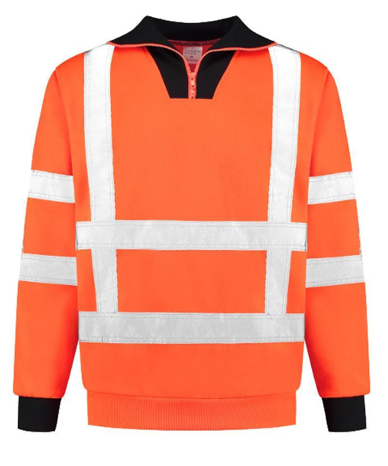 Deze RWS sweater met zipneck is een stevige high-visibility werksweater van 75% polyester en 25% katoen, 300 g/m², en daarmee precies geschikt voor dagen waarop een t-shirt te fris is maar een werkjas te warm.