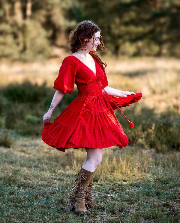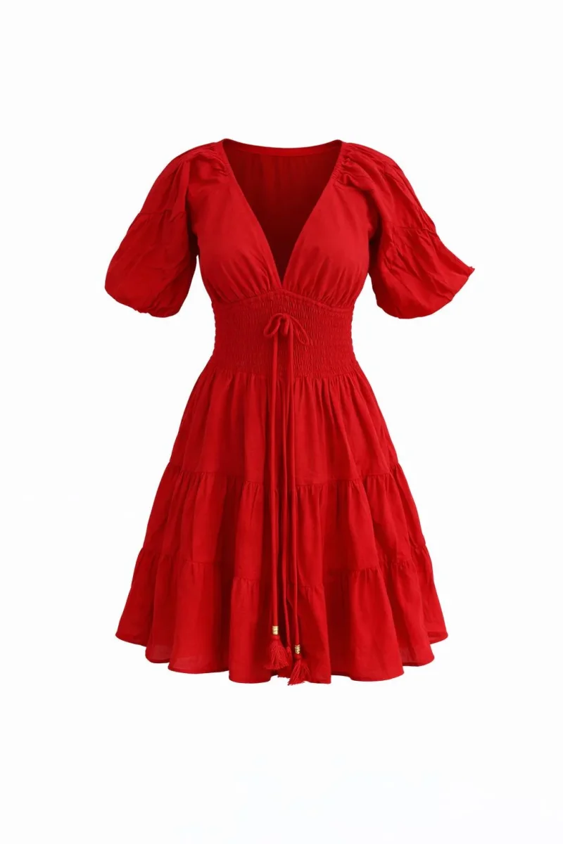 Deze jurk is een ware blikvanger met haar korte ballonmouwen en prachtige diepe decolleté. Dankzij het smockelastiek in de taille sluit deze jurk perfect aan op jouw lichaam. Natuurlijk hebben we drie verschillende maten om uit te kiezen.