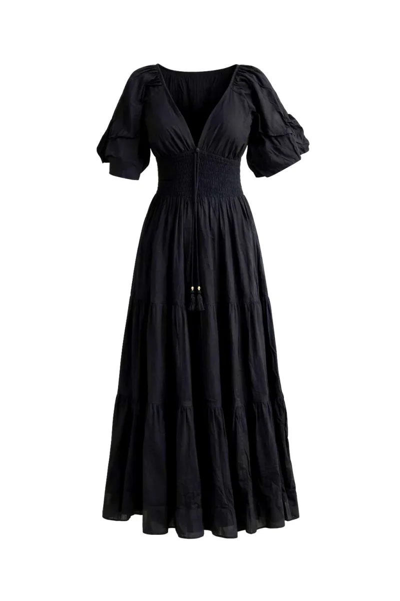 Deze jurk is een ware blikvanger met haar korte ballonmouwen en prachtige diepe decolleté. Dankzij het smockelastiek in de taille sluit deze jurk perfect aan op jouw lichaam. Natuurlijk hebben we drie verschillende maten om uit te kiezen.
