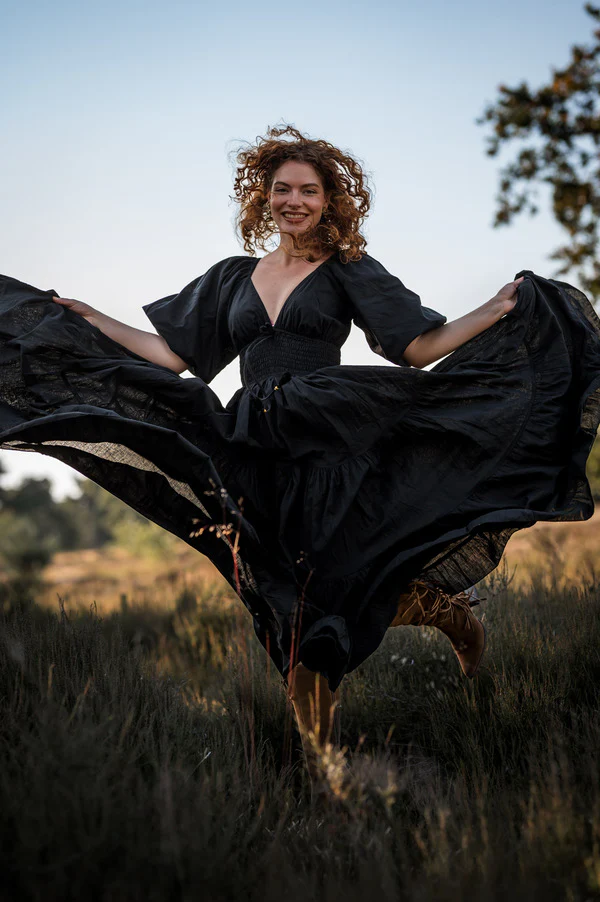 Onder het smockelastiek loopt de jurk wijd en weelderig uit, waardoor je je volledig op je gemak zult voelen. Het bandje is een sierlijk detail dat bijdraagt aan de elegante uitstraling van de jurk. Heb je onze andere jurken al gezien?