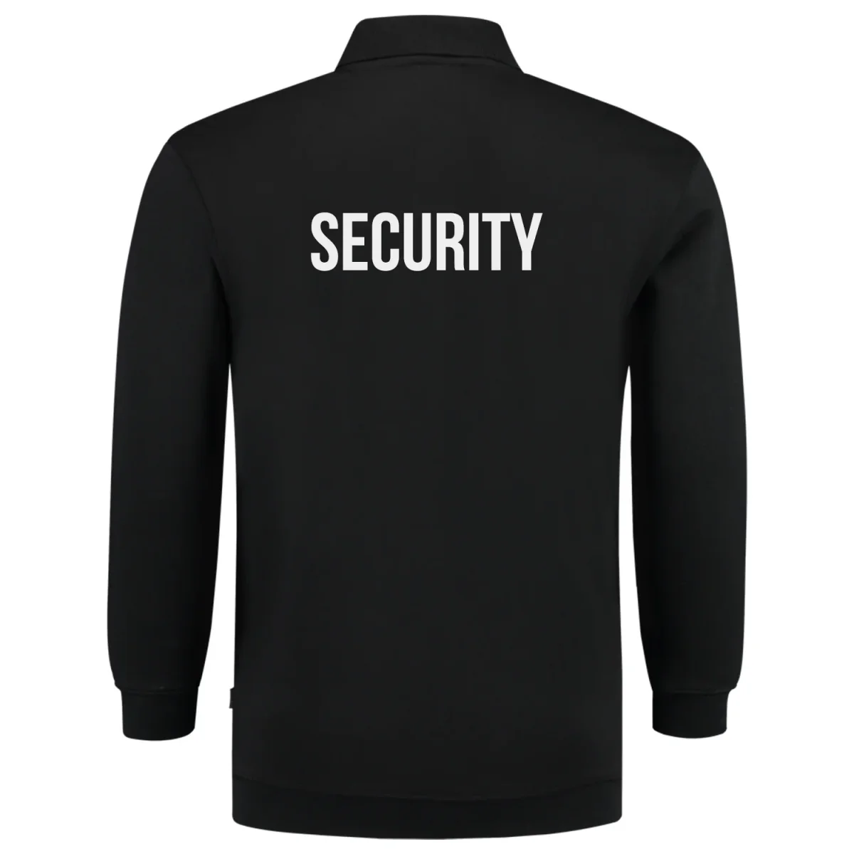 De polosweater is inclusief bedrukking van het beveiligingslogo V-tje (borstlogo) en de tekst SECURITY (ruglogo).