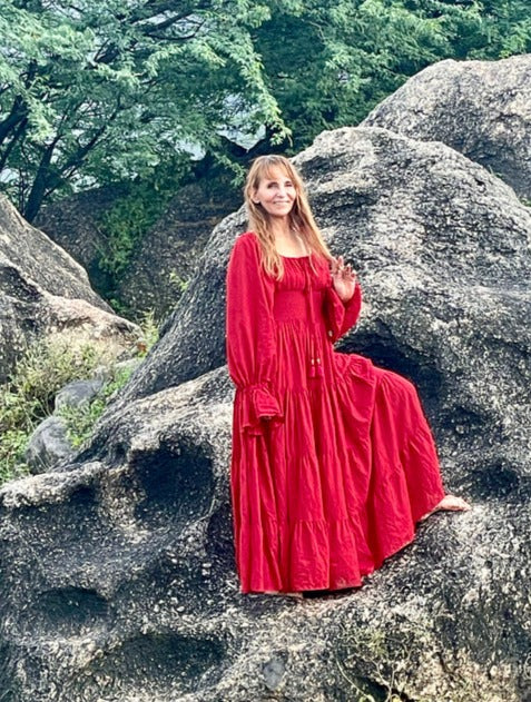 De Vaiana-jurk is met liefde vervaardigd in India, en dat zie je. Of je nu een zomers feestje hebt, een avondje uit plant of gewoon thuis wilt stralen, deze jurk past perfect bij elke gelegenheid. Zelfs als zwangerschaps jurk en ook als trouwjurk!