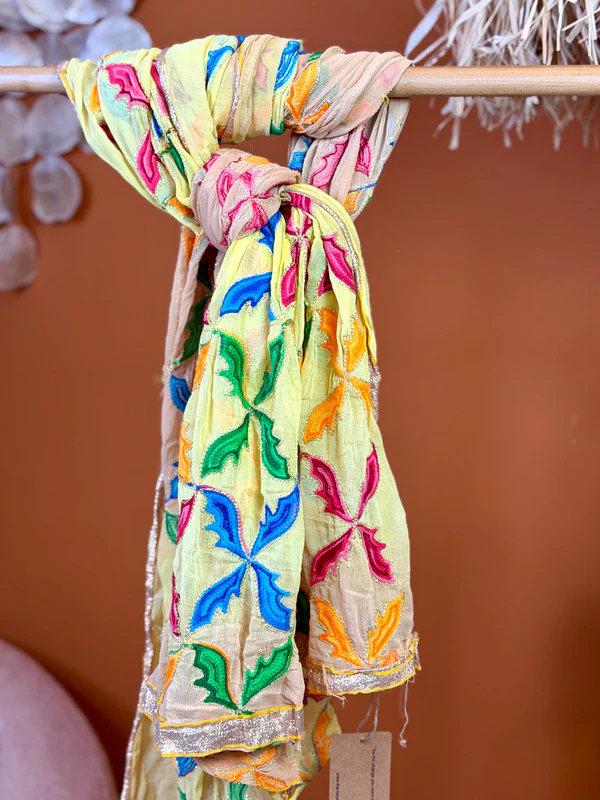 Rechtstreeks uit India, met liefde door mij meegenomen: deze Vintage Indiase sjaals zijn ware schatten. Elke sjaal is een uniek kunstwerk, rijk geborduurd . Geen massaproductie, maar pure slowfashion – duurzaam en met een ziel.