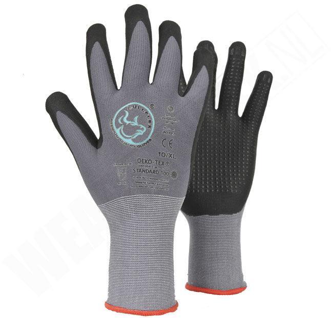 Deze nitril werkhandschoenen zijn gemaakt van nylon met een dunne nitril foam coating. Werkhandschoenen die gemaakt zijn van nitril zijn erg flexibel, sterk en duurzaam. Door deze eigenschappen behoud je een hoge vingergevoeligheid. Nitril rubber wordt veel gebruikt bij chemische- en oliebestendige werkhandschoenen. De werkhandschoenen zijn ook voorzien van speciale nitril nopjes, dit geeft meer grip. De tricot manchetten van deze Bullflex zijn wat langer, namelijk 2 centimeter. Deze werkhandschoen en hebben een hoge vingergevoeligheid en hebben een uitstekende grip door de speciale nopjes. Deze werkhandschoenen zijn voornamelijk geschikt voor assembleer- en montage werkzaamheden, installatietechniek en bij magazijn werkzaamheden.