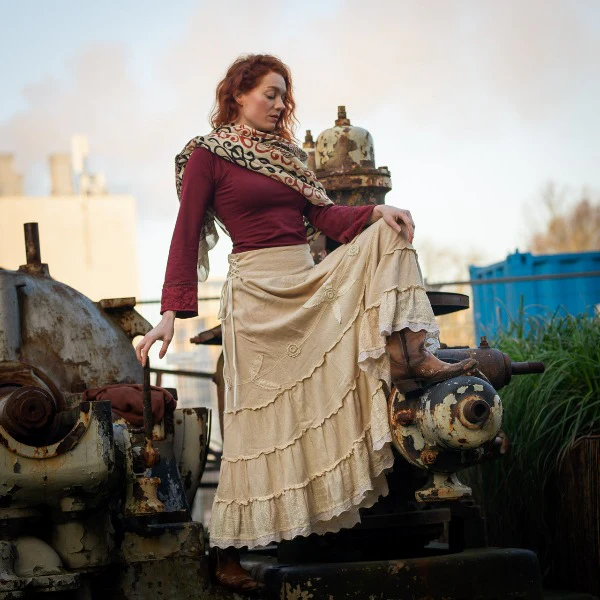 Met zijn betoverende charme van romantisch kant, nostalgische stroken en prachtig borduursel, combineert deze rok moeiteloos het verleden met een eigentijdse stijl.