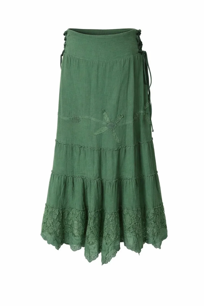 Met zijn betoverende charme van romantisch kant, nostalgische stroken en prachtig borduursel, combineert deze rok moeiteloos het verleden met een eigentijdse stijl.