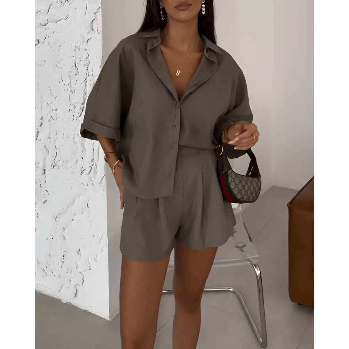 De RAISSA set is de perfecte combinatie van stijl en comfort, ideaal voor warme dagen. Deze tweedelige outfit bestaat uit een losvallende blouse en bijpassende korte broek, ontworpen voor een nonchalante en moderne uitstraling.